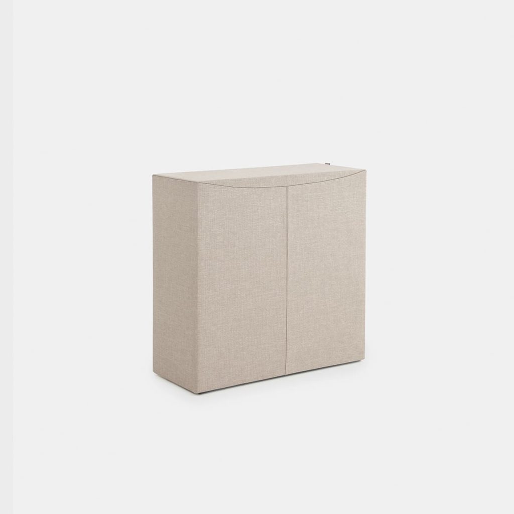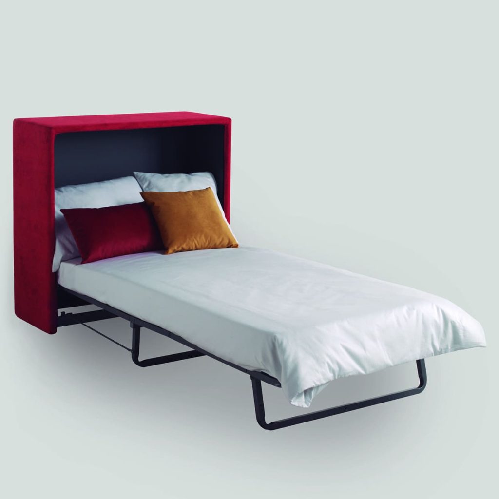 Práctica cama plegable que queda escondidaen un moderno mueble tapizado desenfundable.